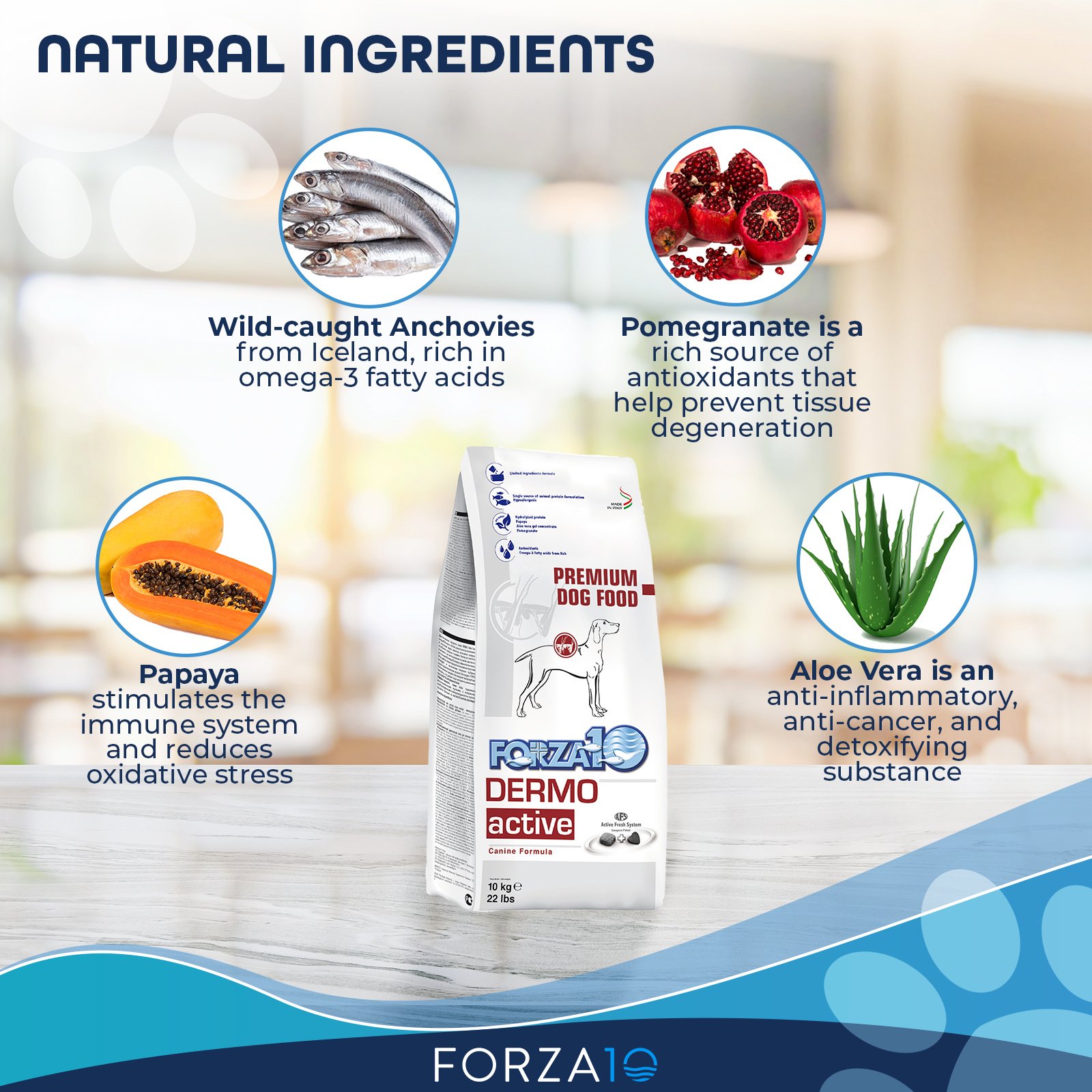 Potato, anchovy meal, potato starch, vegetable oil, fish oil (preserved with mixed tocopherols), potato protein, dried kelp, minerals (dicalcium phosphate, calcium carbonate, zinc sulfate, copper amino acid complex), hydrolyzed fish protein, hydrolyzed potato protein, fructooligosaccharide (FOS), vitamins (vitamin E supplement, ascorbic acid, vitamin B12 supplement, niacin supplement, vitamin A supplement, calcium pantothenate, riboflavin supplement, pyridoxine hydrochloride, thiamine mononitrate, vitamin D3 supplement, folic acid), choline chloride, DL-methionine, yucca schidigera extract, papaya, aloe vera gel concentrate, pomegranate, rosemary extract.