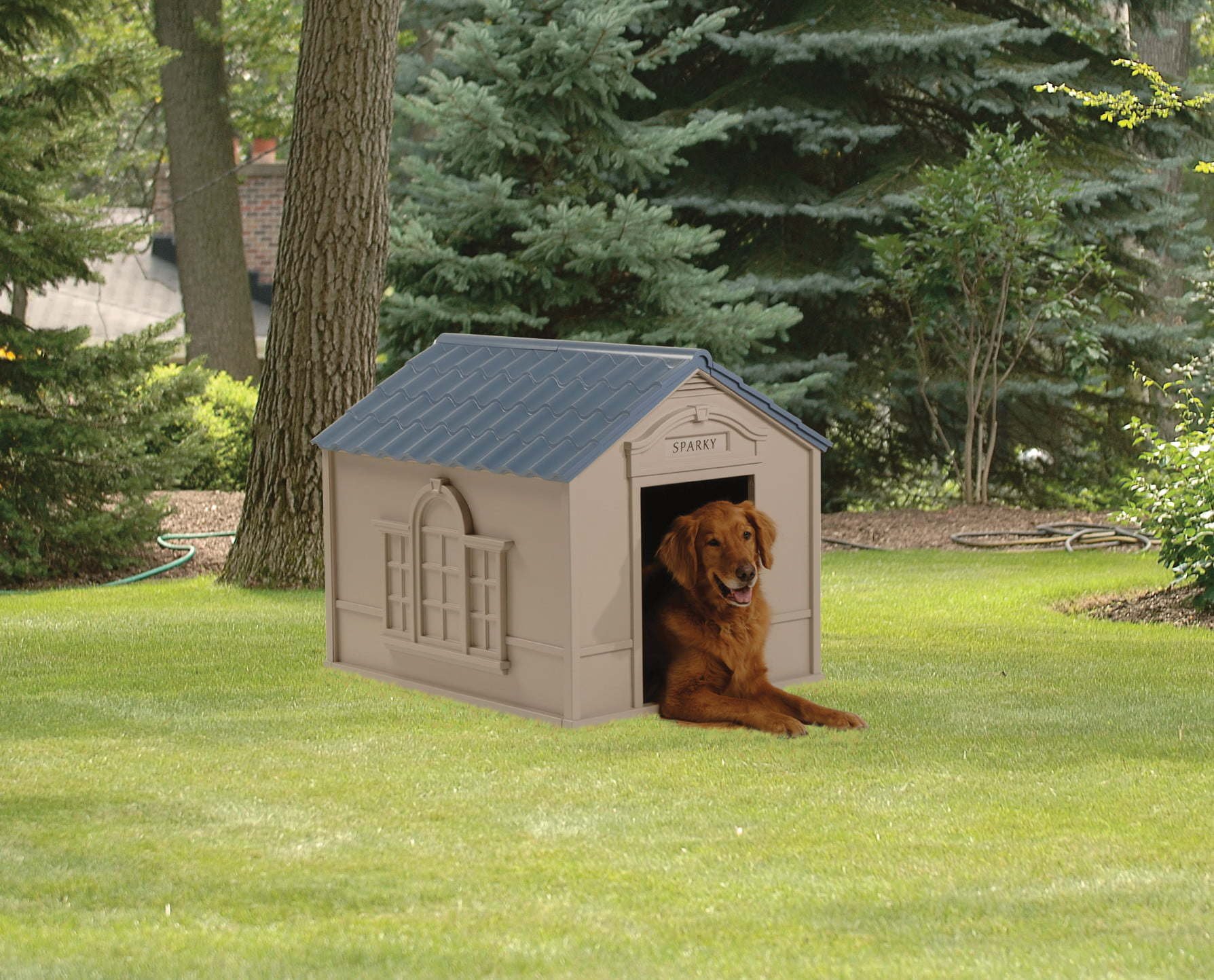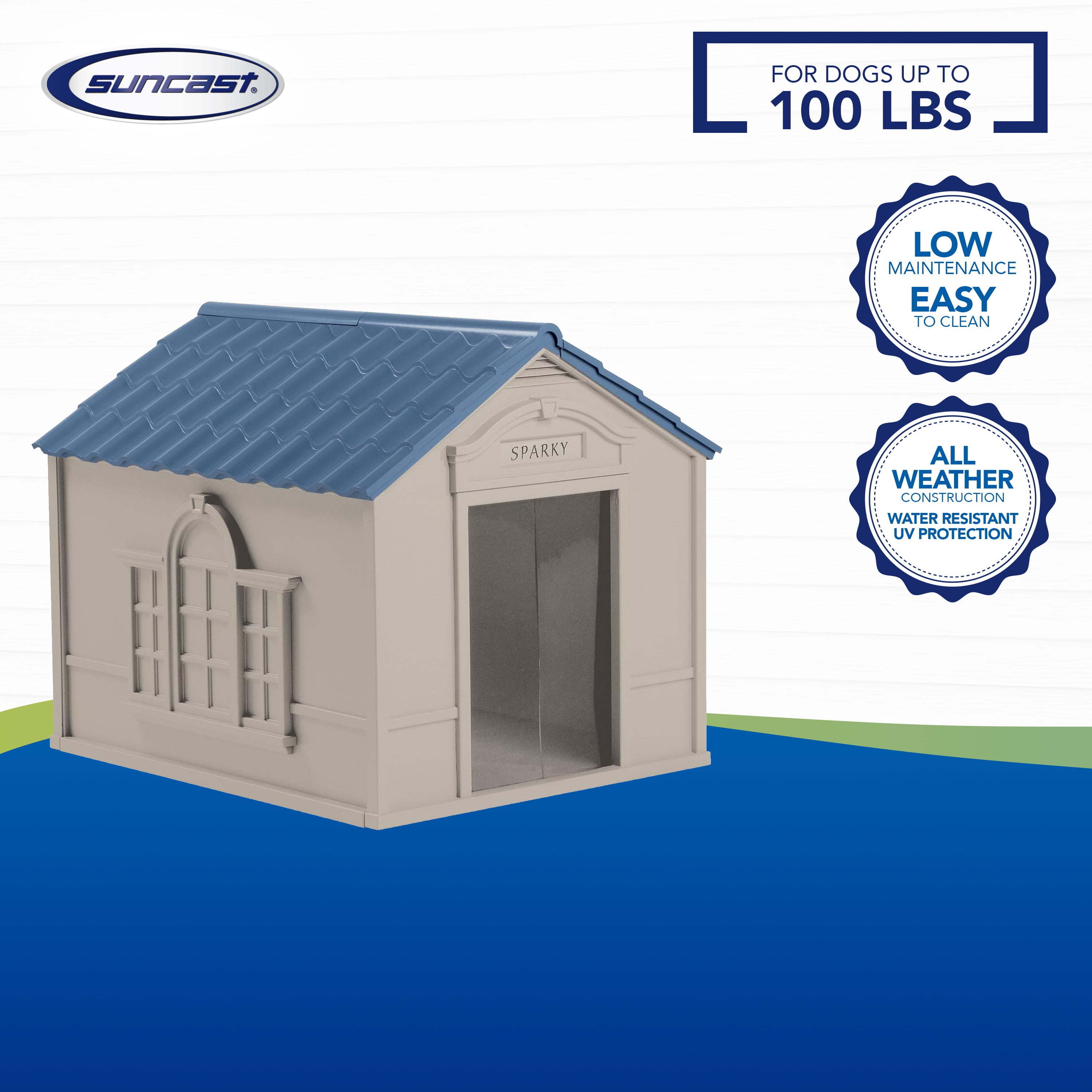 Give your pet a cozy place to rest and get out of the weather with this Deluxe Personalized Dog House. This light taupe dog house is made out of extremely durable, weatherproof resin materials and comes with a matching vinyl door to allow easy access for your dog. It features easy snap-together assembly, as well a stylish look that will coordinate with many home architectural styles. It comes with letters to spell out your dog's name for a personalized touch. It also has a removable blue roof for easy cleaning and a crowned floor with a channel that helps to capture fluids and keep your pet clean and dry. This vinyl dog house can be staked to the ground and is equipped with vents that provide superior air circulation. This dog house is designed for canines up to 100 lbs. and is meant for outdoor use, but can be used inside as well. 's Deluxe Personalized Dog House measures 33" x 38.5" x 32", with a door opening of 11.75" x 20.5", the perfect size to shelter your pup.