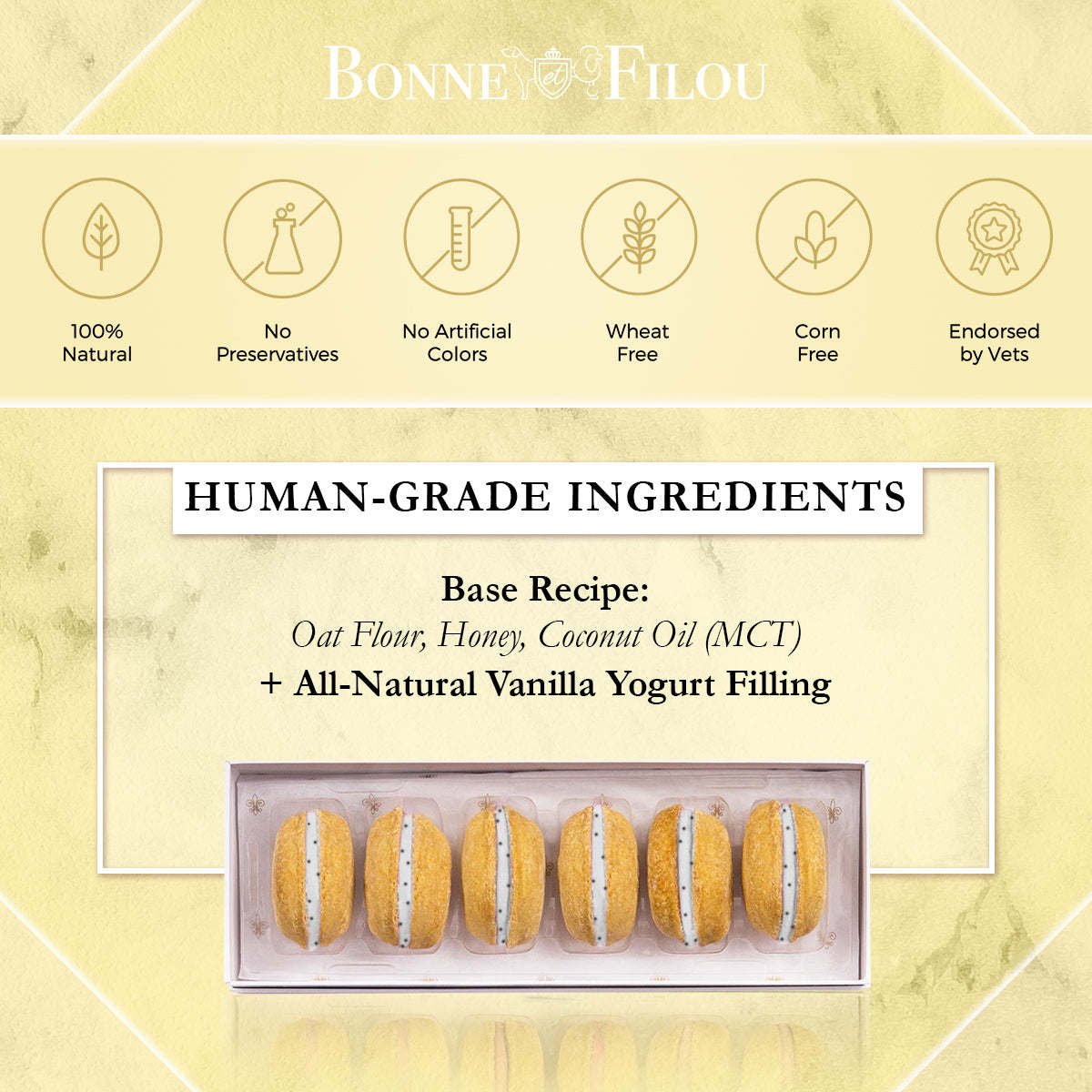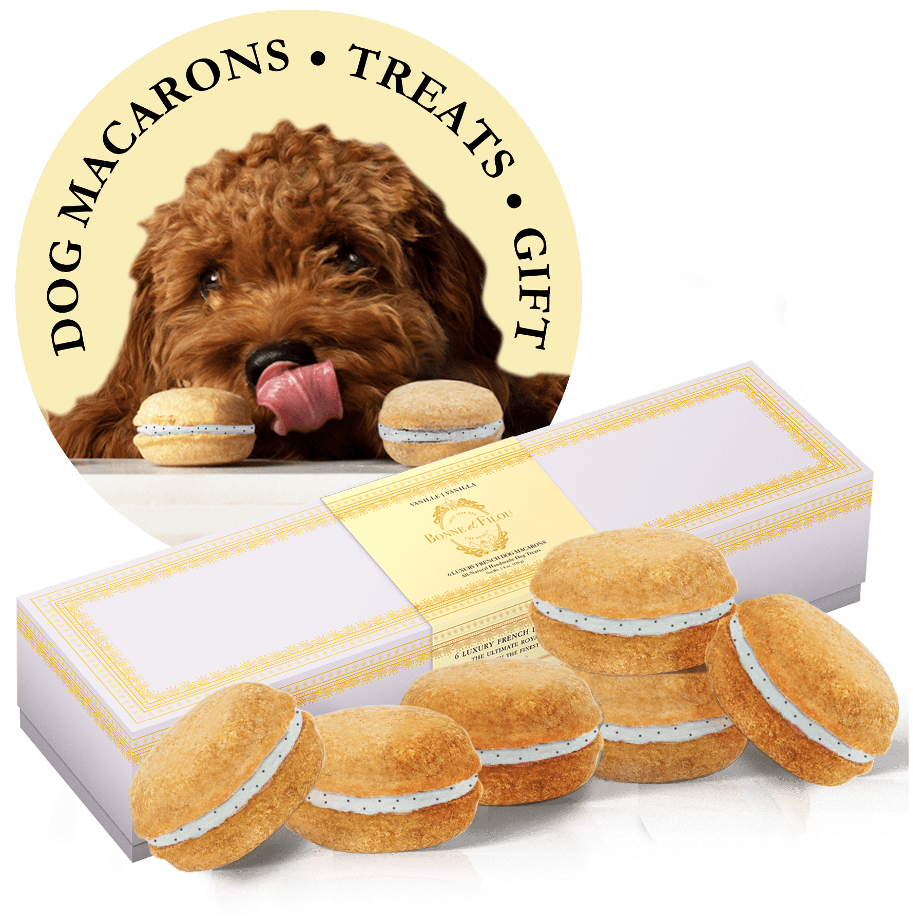 Dog Macarons - Count of 6 (Dog Treats | Dog Gifts)This box of our premium macaron treats features: - Box of 6 dog macarons- Handmade with premium human-grade ingredients in the USA- 100% natural; corn-free; wheat-free ingredients- No artificial coloring or preservatives- Hard treat designed for a long-lasting chew- Shelf life of 12+ months | No need for refrigerationBase Recipe Ingredients: Oat Flour; Honey; Coconut Oil; All-Natural Flavored Yogurt FillingFeeding Instructions:Our treats are hard; designed for a long-lasting chew. For elderly or small dogs; we recommend breaking the treat in smaller pieces (by twisting both sides).