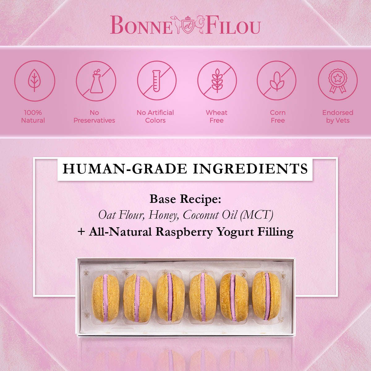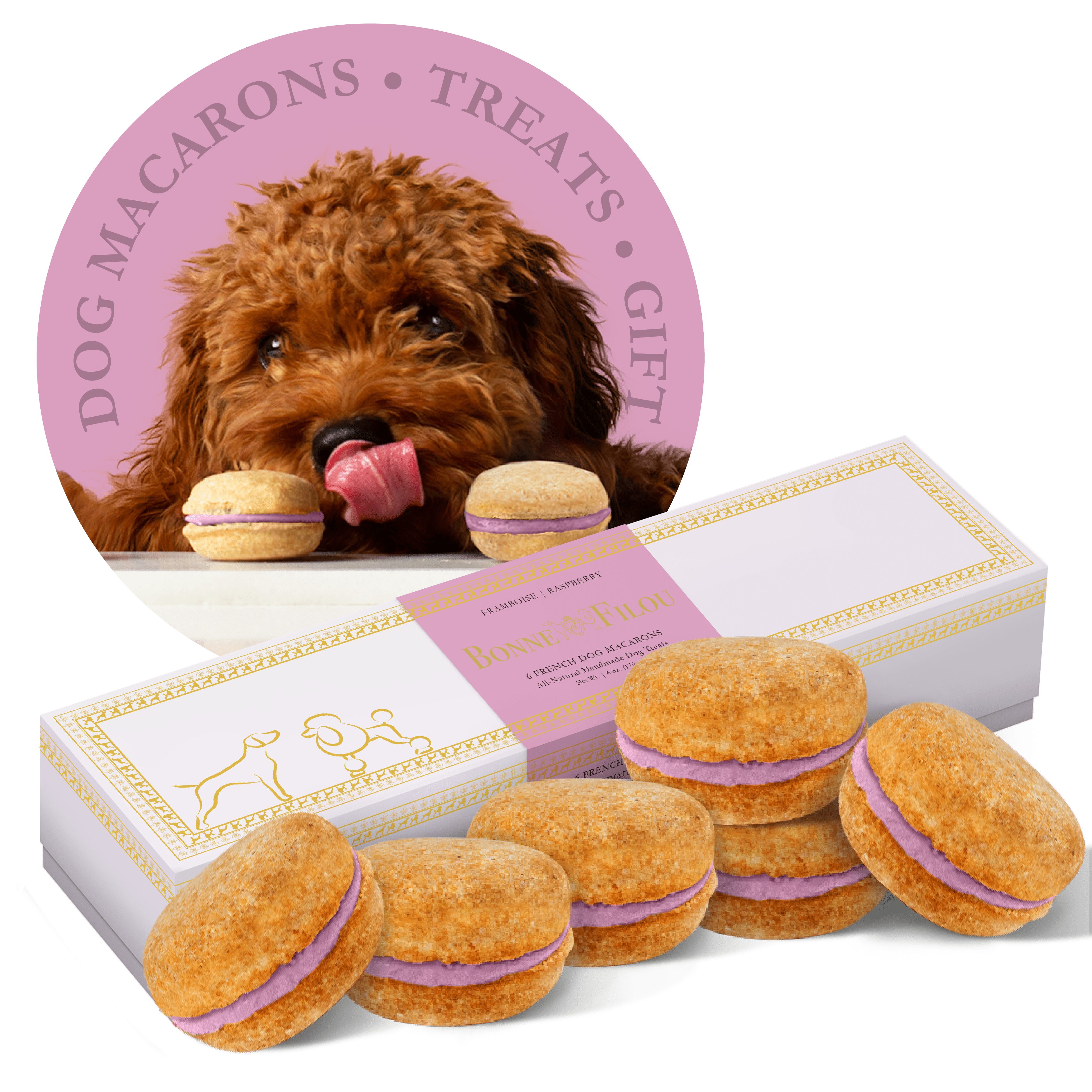 Dog Macarons - Count of 6 (Dog Treats | Dog Gifts)This box of our premium macaron treats features: - Box of 6 dog macarons- Handmade with premium human-grade ingredients in the USA- 100% natural; corn-free; wheat-free ingredients- No artificial coloring or preservatives- Hard treat designed for a long-lasting chew- Shelf life of 12+ months | No need for refrigerationBase Recipe Ingredients: Oat Flour; Honey; Coconut Oil; All-Natural Flavored Yogurt FillingFeeding Instructions:Our treats are hard; designed for a long-lasting chew. For elderly or small dogs; we recommend breaking the treat in smaller pieces (by twisting both sides).
