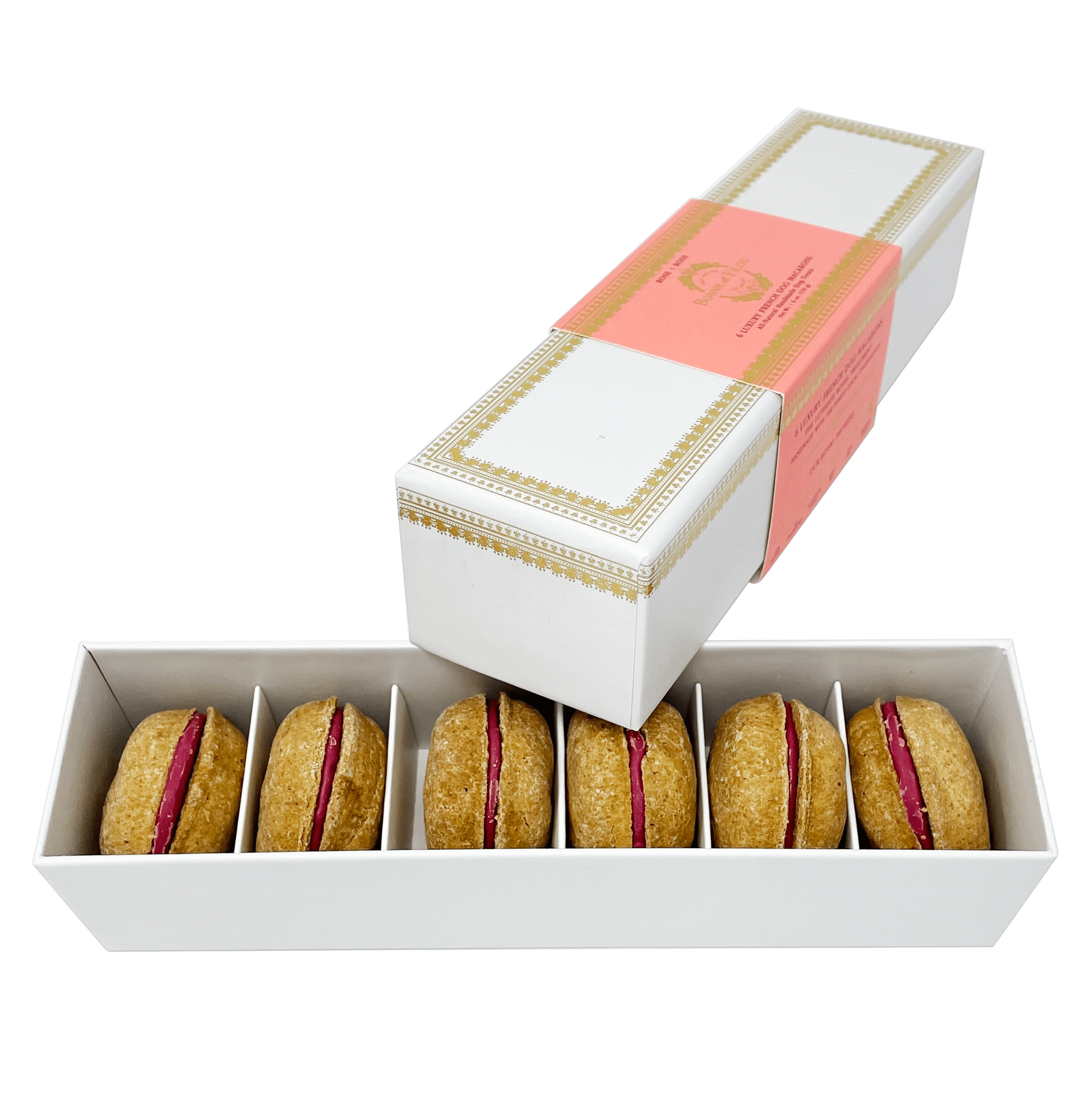 Dog Macarons - Count of 6 (Dog Treats | Dog Gifts)This box of our premium macaron treats features: - Box of 6 dog macarons- Handmade with premium human-grade ingredients in the USA- 100% natural; corn-free; wheat-free ingredients- No artificial coloring or preservatives- Hard treat designed for a long-lasting chew- Shelf life of 12+ months | No need for refrigerationBase Recipe Ingredients: Oat Flour; Honey; Coconut Oil; All-Natural Flavored Yogurt FillingFeeding Instructions:Our treats are hard; designed for a long-lasting chew. For elderly or small dogs; we recommend breaking the treat in smaller pieces (by twisting both sides).