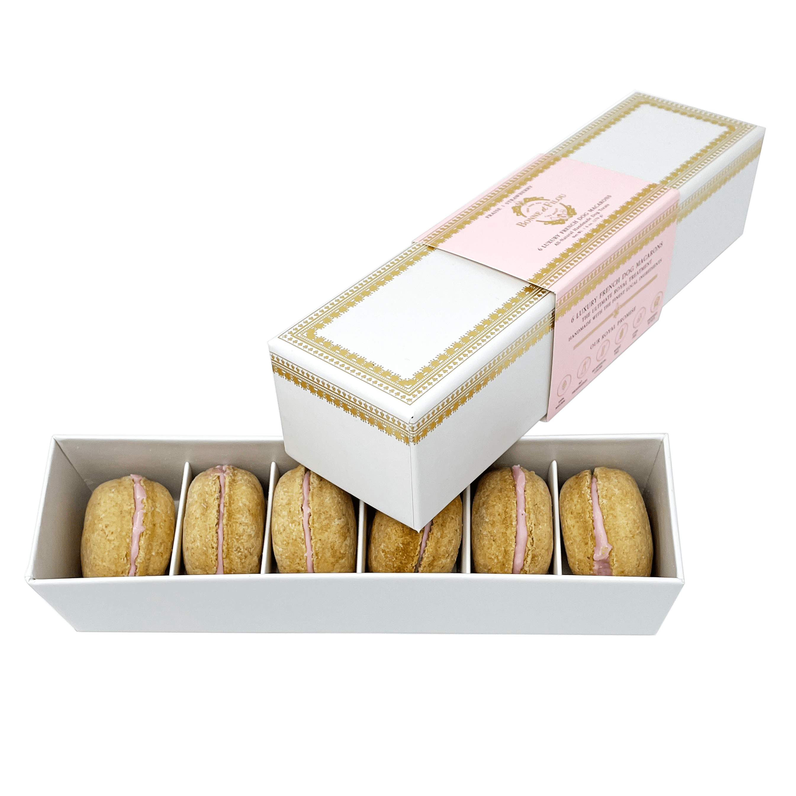 Dog Macarons - Count of 6 (Dog Treats | Dog Gifts)This box of our premium macaron treats features: - Box of 6 dog macarons- Handmade with premium human-grade ingredients in the USA- 100% natural; corn-free; wheat-free ingredients- No artificial coloring or preservatives- Hard treat designed for a long-lasting chew- Shelf life of 12+ months | No need for refrigerationBase Recipe Ingredients: Oat Flour; Honey; Coconut Oil; All-Natural Flavored Yogurt FillingFeeding Instructions:Our treats are hard; designed for a long-lasting chew. For elderly or small dogs; we recommend breaking the treat in smaller pieces (by twisting both sides).