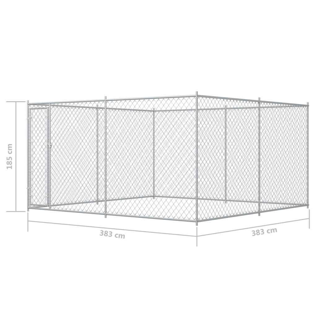 This large dog kennel provides ample exercise space while the chain link mesh all around helps prevent mischief and unexpected accidents; while enabling ventilation. Thanks to the sturdy and heavy-duty galvanized steel construction; this high-quality dog kennel is durable and built to last. The hinged door ensures extra security and safety for your dogs thanks to the lockable latch system. Assembly is really easy.Material: Galvanized steelOverall dimensions: 150.8" x 150.8" x 72.8" (L x W x H)Ground surface area: 157.2 ft²Lockable latch systemChain-link mesh sidewallsEasy to assembleSuitable for dogsInner dimensions: 148.4" x 148.4" x 70.9" (W x D x H)