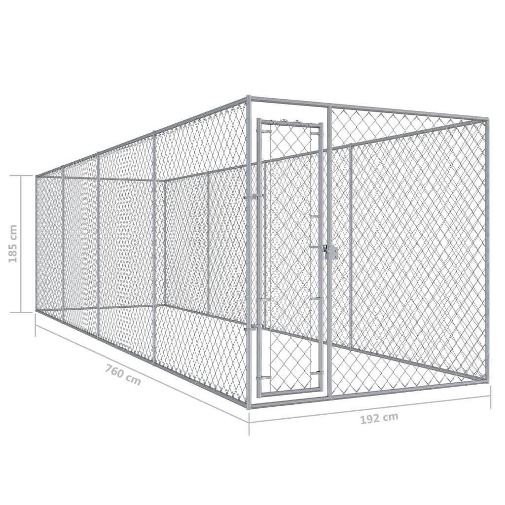 This large dog kennel provides ample exercise space while the chain link mesh all around helps prevent mischief and unexpected accidents; while enabling ventilation. Thanks to the sturdy and heavy-duty galvanized steel construction; this dog kennel is durable and built to last. The hinged door ensures extra security and safety for your dogs thanks to the lockable latch system. Assembly is really easy.Material: Galvanized steelOverall dimensions: 299.2" x 75.6" x 72.8" (L x W x H)Inner dimensions: 297.2" x 73.2" x 70.9" (L x W x H)Ground surface area: 157.2 ft²Lockable latch systemChain-link mesh sidewallsEasy to assembleSuitable for dogs