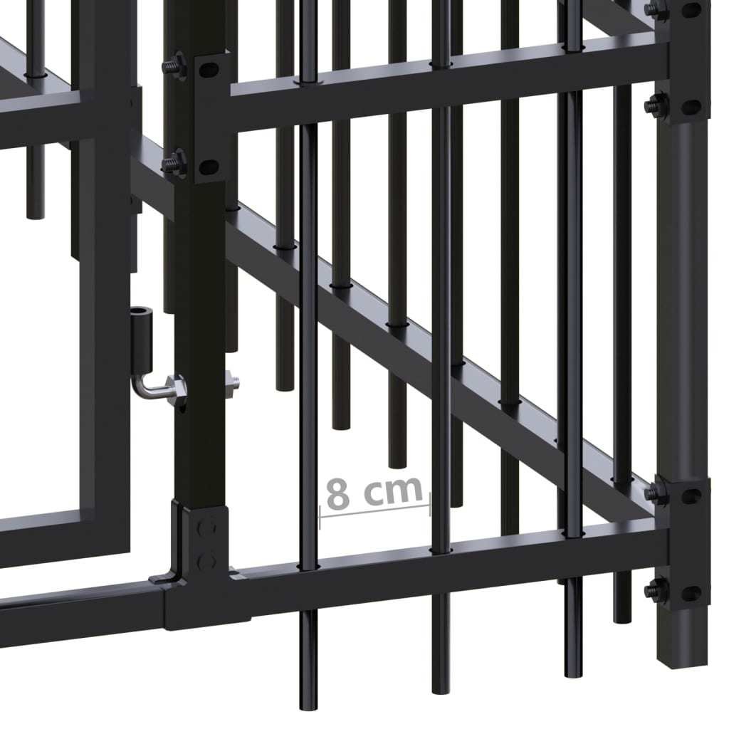 This dog kennel provides ample exercise space. The walls of steel bars help prevent mischief and unexpected accidents while enabling ventilation. Thanks to the sturdy powder-coated steel construction; this dog kennel is durable and built to last. The hinged door with a lockable latch system ensures extra security and safety for your dogs.Color: BlackMaterial: Powder-coated steelOverall dimensions: 378" x 226.8" x 78.7" (L x W x H)Door size: 19.7" x 70.9" (W x H)With a doorLockable latch systemAssembly required: Yes
