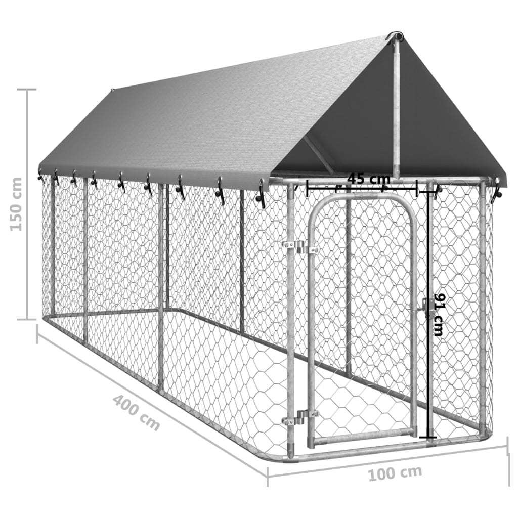 This large dog kennel provides ample exercise space while the mesh all around helps prevent mischief and unexpected accidents while enabling ventilation. Thanks to the sturdy and heavy-duty galvanized steel construction, this quality dog kennel is durable and built to last. Made of 100% polyethylene, the included top canopy is fire-resistant and UV protected, providing protection from sun, rain, snow, as well as other weather conditions. The hinged door with lockable latch system ensures extra security and safety for your dogs.Color: SilverMaterial: Galvanized steel, fabric (100% polyethylene)Overall dimensions: 157.5" x 39.4" x 59.1" (L x W x H)Gate size: 17.7" x 35.8" (W x H)With a roofLockable latch systemAssembly required: Yes