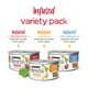 Canned dog food variety pack contains three protein-rich, meaty dog food selections infused with sunflower oil, fish oil or bone broth