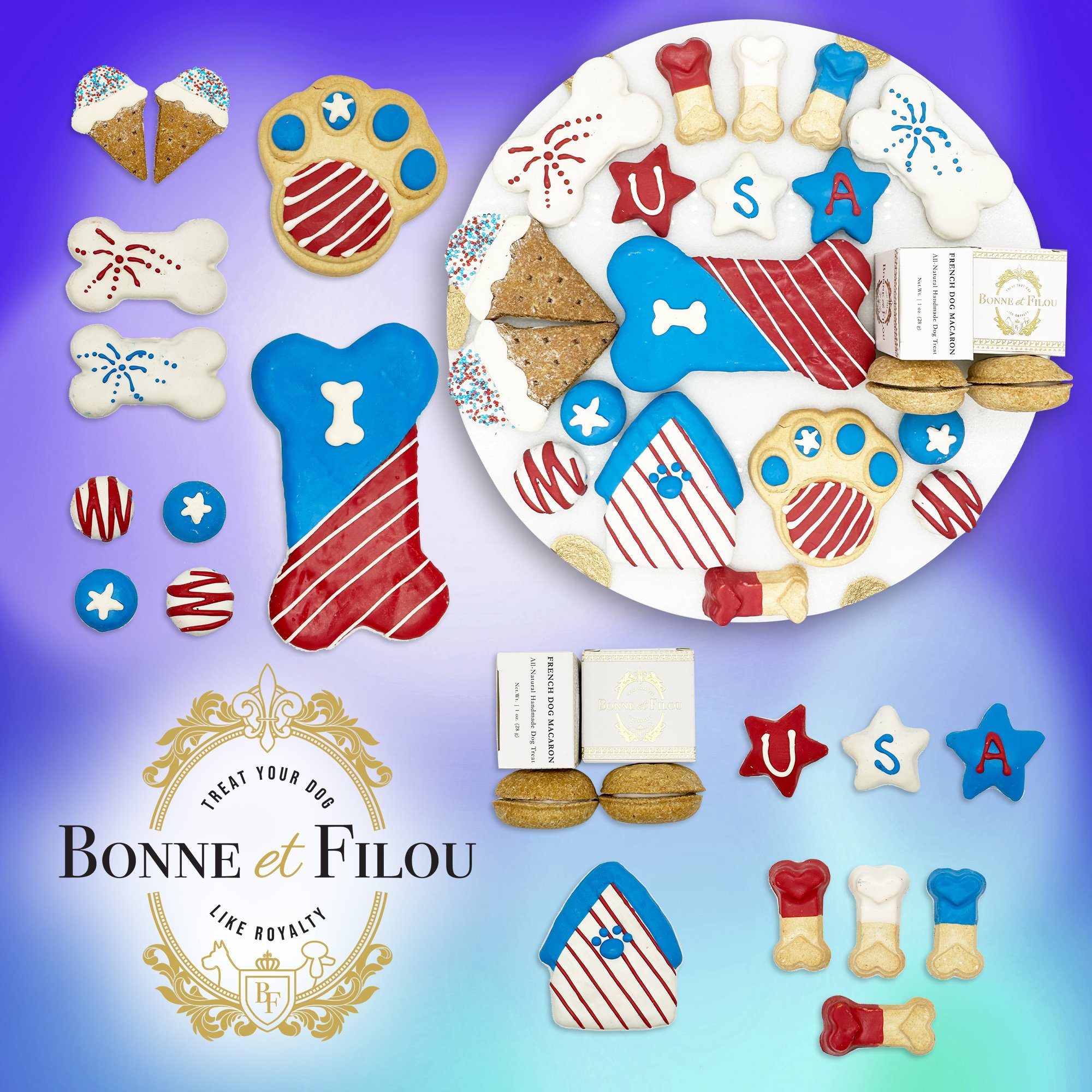 Each ornate gift box comes overflowing with a curated selection of dog-gone delicacies including sumptuous dog macarons, crunchy dog bones, round and stars shaped treats, all decorated in Red, White, Blue colors!